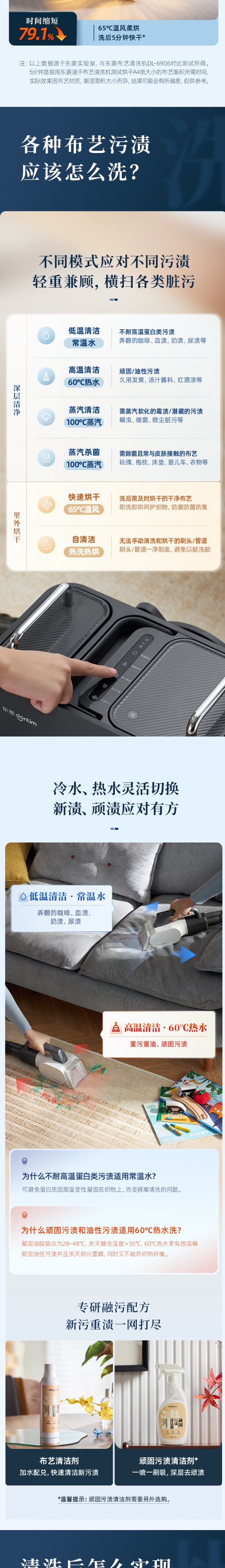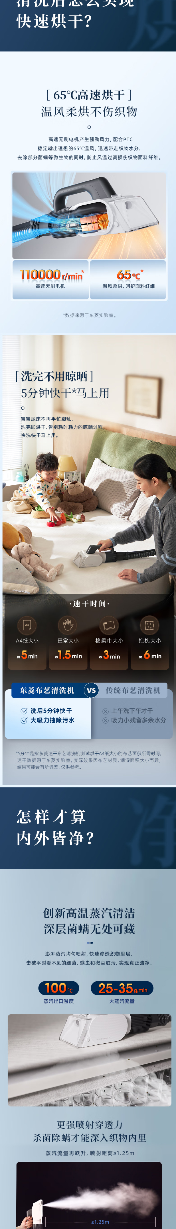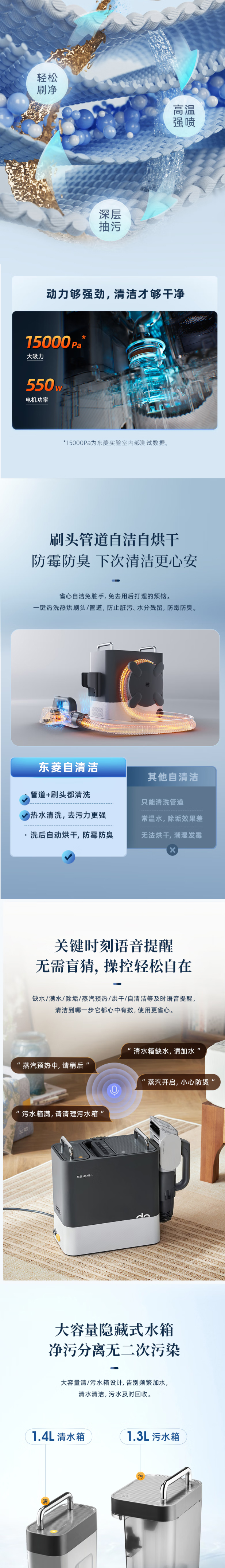 容量 :净水箱1.4L、污水箱1.3L 65°C高速烘干,5分钟快干马上用 低温清洁/高温清洁/蒸汽清洁/蒸汽杀菌 一键刷头/管道自洁自烘干,内外皆净